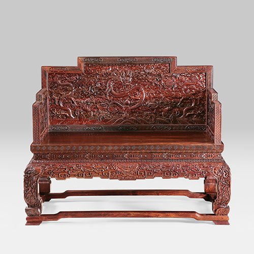此寶座選用珍貴的大紅酸枝作為原材料,搭腦呈平頭狀,靠背中間高,向兩邊扶手遞減呈梯形。結構設計巧妙,對稱布局,每個面板皆雕著一條騰飛的金龍,刀法精密,圓潤渾厚;龍紋栩栩如生,云紋舒卷生動,龍的姿態各異,有的昂首前瞻,有的回首瞭望,動感十足。座面嵌裝硬板,束腰內收,雕有纏連枝紋,四條三彎腿做同樣的獸首,足下踩有豐碩的地平,端莊穩重。